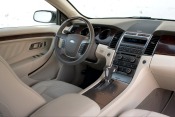 Inside, the new Taurus exhibits a graceful arching design philosophy that is pleasing to the eye, but less so to the touch. Notably, while the high-quality dash pads are soft and elegantly joined to the high, sweeping center console, the latter consists of hard plastic despite being more likely to be pressed on by hands and knees. Moreover, although the dashboard's massive overhanging twin cowls keep incoming glare in check, the spongy vinyl construction reminds us of a disco-era beanbag chair. To the Taurus' credit, though, all elements are solidly assembled, with few squeaks and rattles.